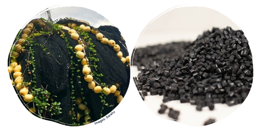 Waste end-of-life purse seine nets discarded at port (left), Polyamide pellets produced from recycling purse seine nets (right).