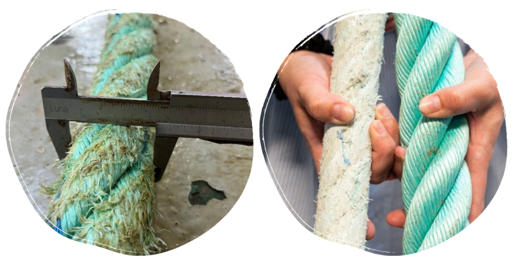 Left: Measuring the level of wear in a demersal seine rope that has undergone abrasion. Right: a comparison of used (left) and new (right) ropes. Image Credit: Sintef.