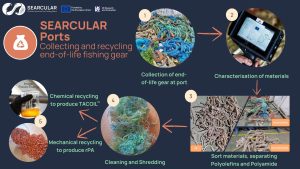 An example of process from collection of end-of-life fishing gear at ports to the production of secondary raw material.